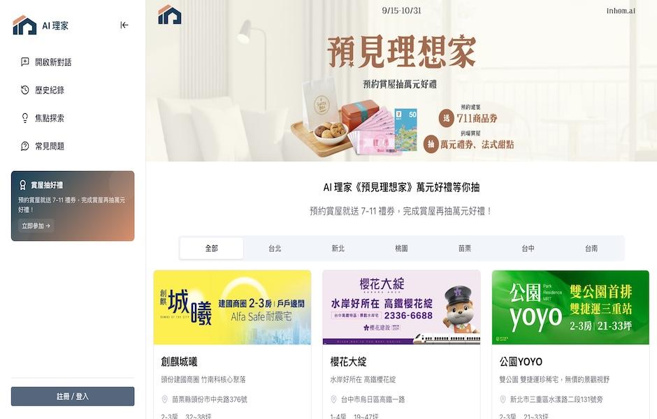 《AI理家》首波賞屋抽獎告捷:近萬人次造訪、5,300+建案查詢、2,500+預約,導客效率較傳統提升約35%。9/15–10/31啟動「預見理想家」新活動:平台預約送7-11禮券NT$50,現場賞屋再抽萬元百貨禮券與NT$720法式點心禮盒;後續將強化首購族個人化建議與內容,持續以對話式搜尋引擎引領智慧找房。